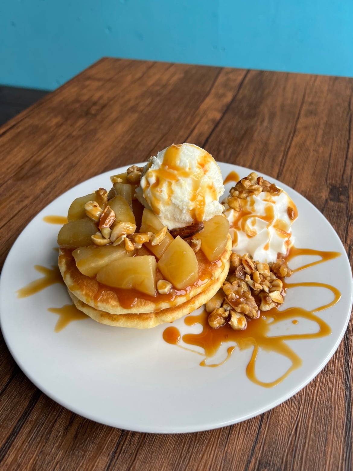 ふんわりのパンケーキの上にはりんごのコンポートと、アイスクリーム、キャラメルナッツがのっています🥞🍦🍎